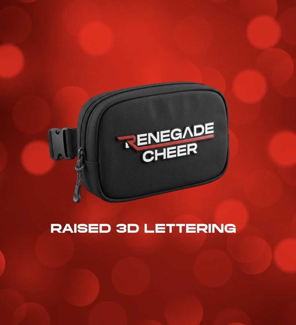 This fanny pack features our signature “RENEGADE CHEER” logo in bold red and white raised 3D lettering for a premium, textured look that stands out.